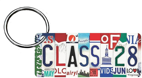 Class of 28 License plate design on light weight thin metal to create a unique and one of a kind keychain or bag tag. Photo of unique license plate art design printed onto a durable metal key chain. Celebrate their special year with a unique and one-of-a-kind gift. Also makes a great decorative tag when wrapping gifts for new drivers.